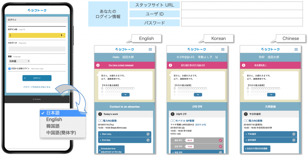 - 「シフトーク」はアプリではない為、PC・タブレットなど、ブラウザを搭載している端末であれば、スタッフサイトの閲覧は可能です。